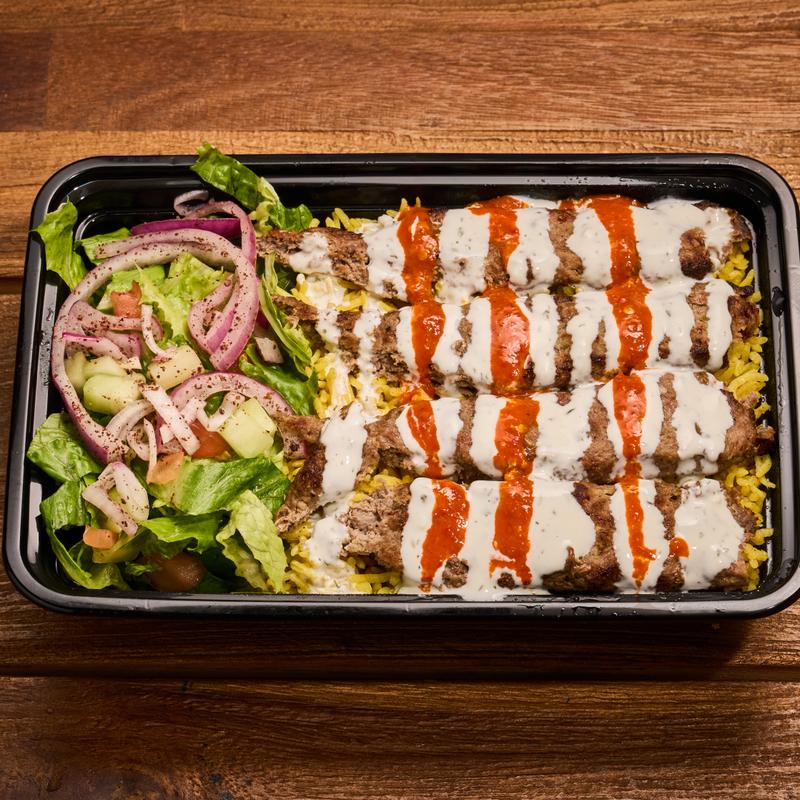 basmati yellow rice, freshly grilled beef kebab, served with spring onion, cucumbers, lettuce, tomatoes, creamy white sauce and hot sauce.