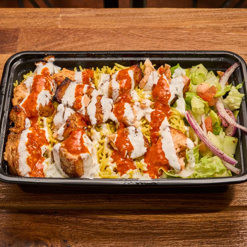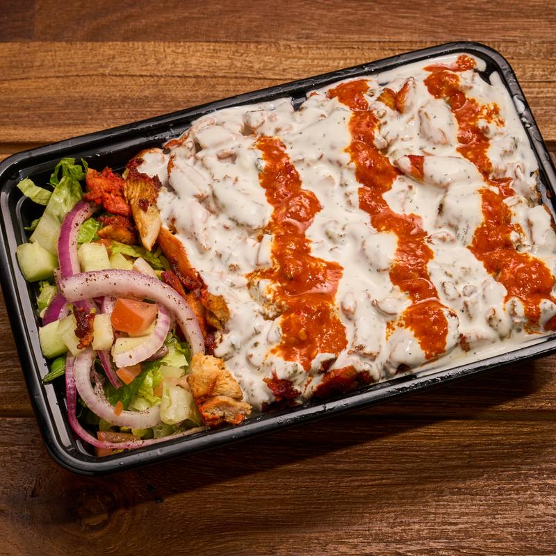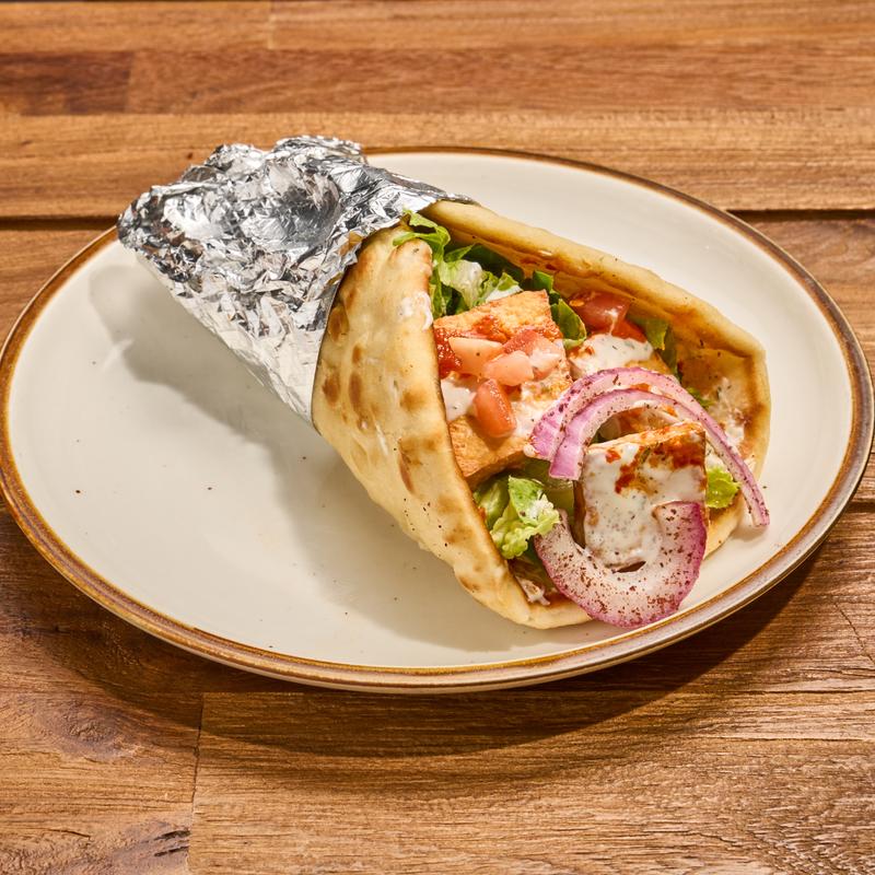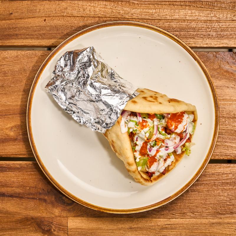 Warm pita bread filled with chicken and mixed greens served with our signature white sauce and hot sauce