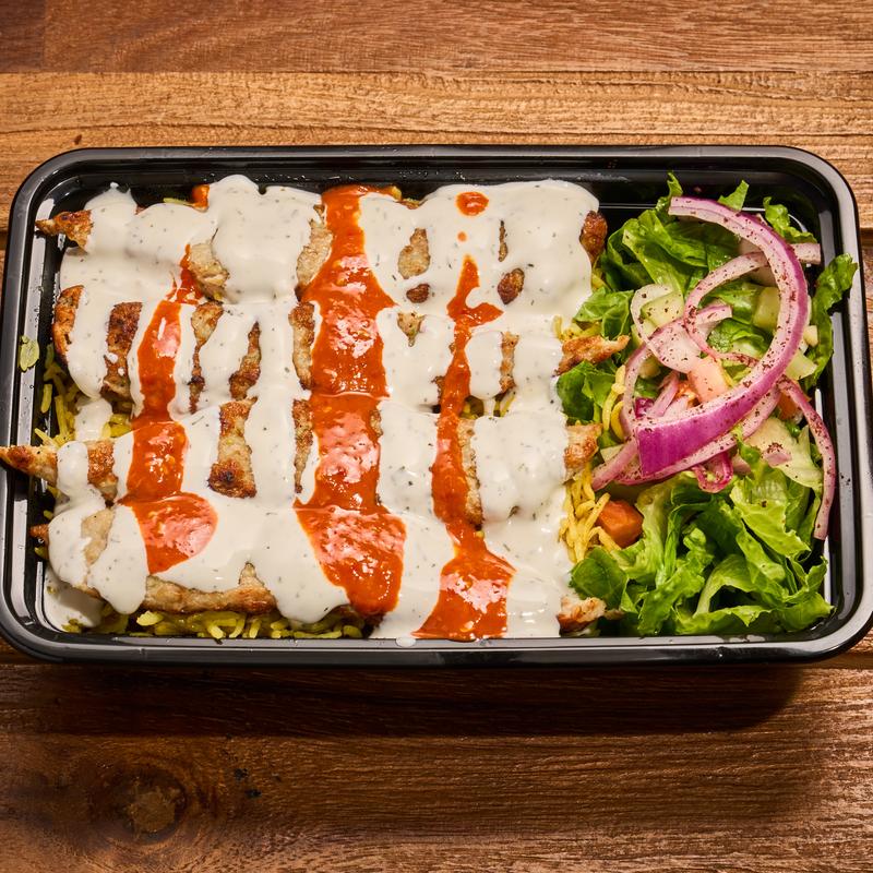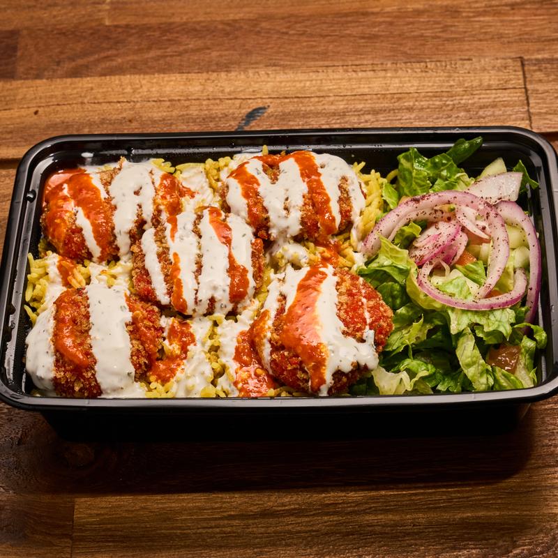 basmati yellow rice, crispy fried chicken, spring onion, cucumbers, lettuce, tomatoes, creamy white sauce and hot sauce