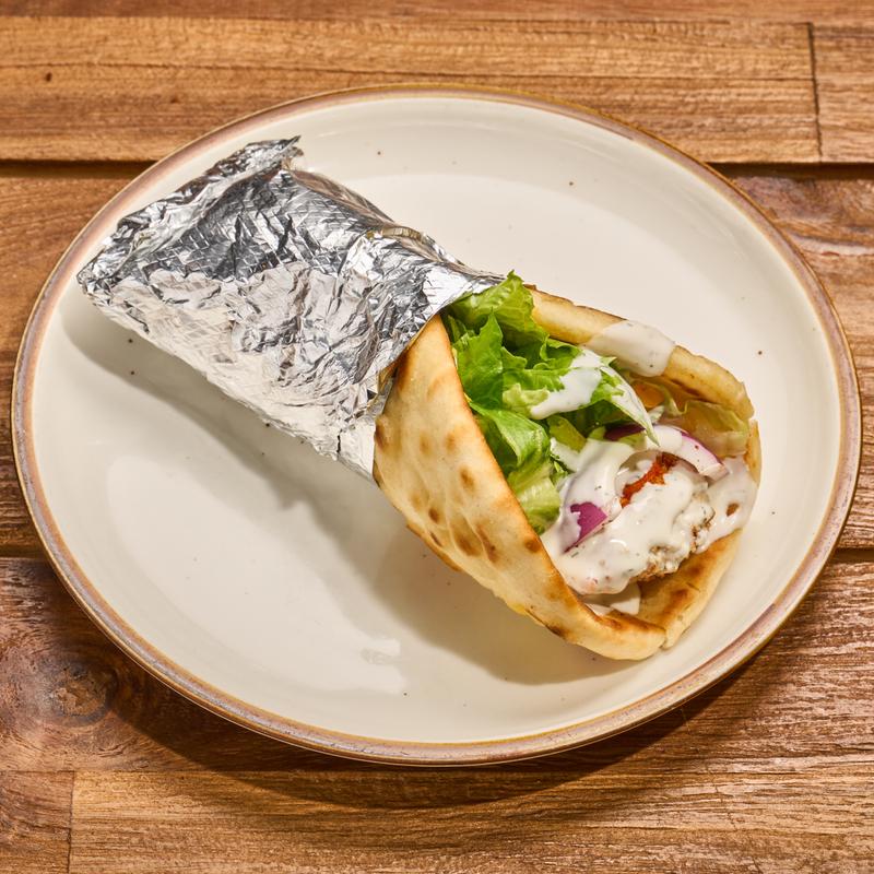 Warm pita bread filled with falafel and mixed greens served with our signature white sauce and hot sauce