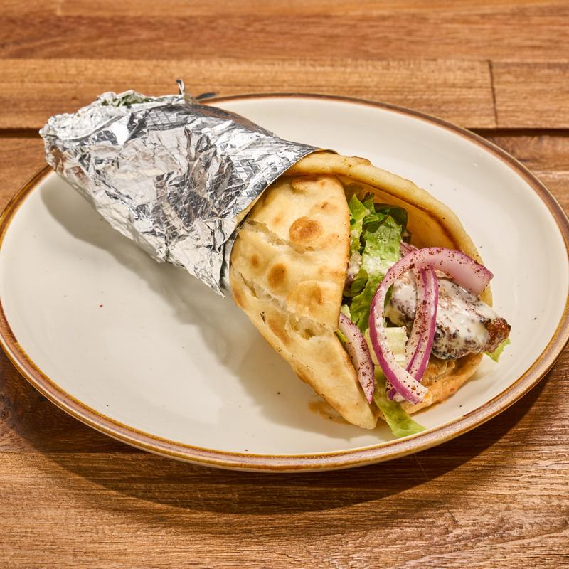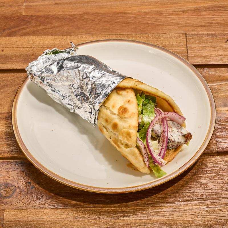 Warm pita bread filled with freshly grilled lamb kebab and mixed greens served with our signature white sauce and hot sauce