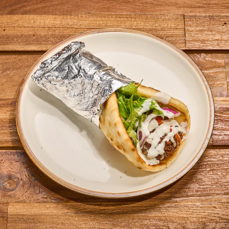 Warm pita bread filled with freshly grilled beef kebab, mixed greens served with our signature white sauce and hot sauce